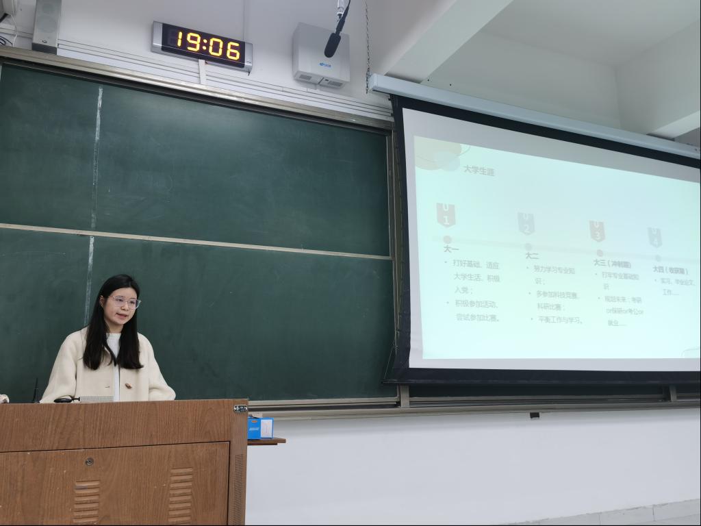 赋能新学期,启航新征程。3月5日晚,金沙js4399首页在J14-321举办优秀学长学姐经验交流分享会,本期邀请的是全国优秀共青团员、学校十大优秀学生王雨佳作为优秀学姐代表做经验分享。分享会由2023级本科生辅导员王键国主持,学院本科2023级全体新生参加。
