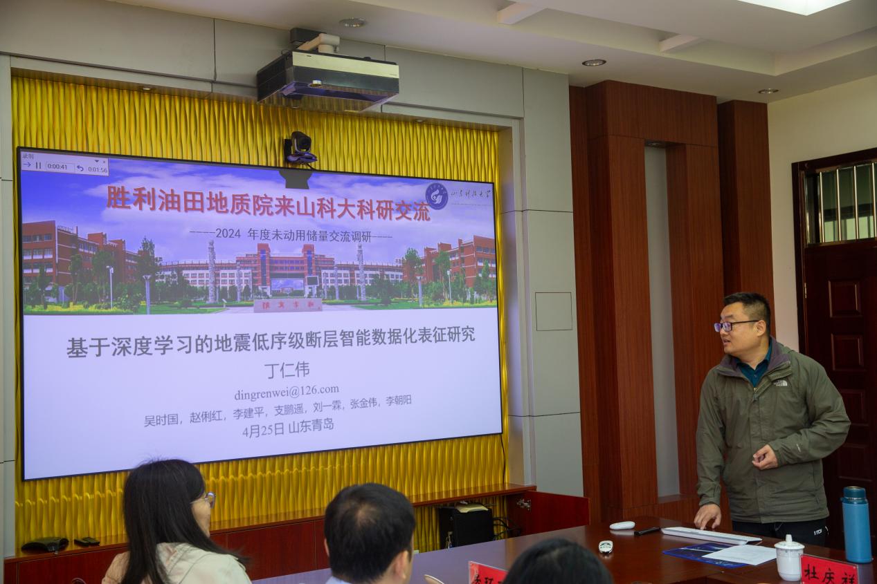 交流过程中,围绕油田难动用储量的储层研究技术问题展开,谢俊、栾锡武、林年添、杨思通和丁仁伟等五位教授和老师,结合自己多年的研究,分别做了题为“裂缝识别、描述与数值模拟研究-以苏东39-61气藏为例”、“青岛市‘一带一路’深水油气创新中心简介”、“油气储层分布预测及评价的机器学习与束搜索追踪方法研究”、“基于多源信息融合的复杂储层多尺度综合智能评价研究”和“基于深度学习的地震低序级断层智能数据化表征研究”的交流介绍。交流座谈后,大家一起参观了地球科学馆。