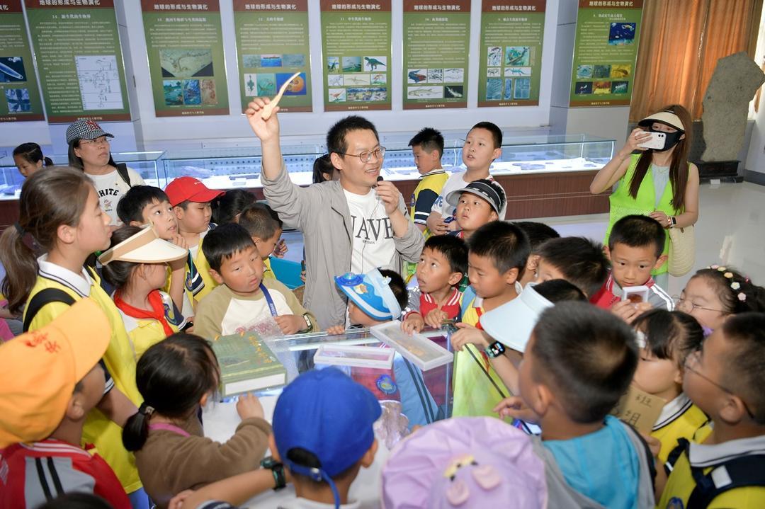 活动期间,青岛西海岸新区衡山路小学师生家长、我校外国语学院团委及我院2023级本科生等300余人参加此次活动。我院古生物教授陈雷老师通过对“恐龙蛋化石的发现”、“恐龙蛋分类”、“古生物学家如何研究恐龙蛋”等内容的讲解,带领小学生们走进恐龙世界,了解恐龙的奥秘;地球科学馆馆长王倩老师通过一个个趣味小故事生动地讲解馆藏标本,为孩子们了解地球打开一扇窗户;地球科学馆志愿讲解员引导参观大学生观察方解石晶洞、水晶晶簇、雄黄雌黄等各类馆藏标本。参观过程中,同学们踊跃发言,积极互动,不断提出奇思妙想的问题。