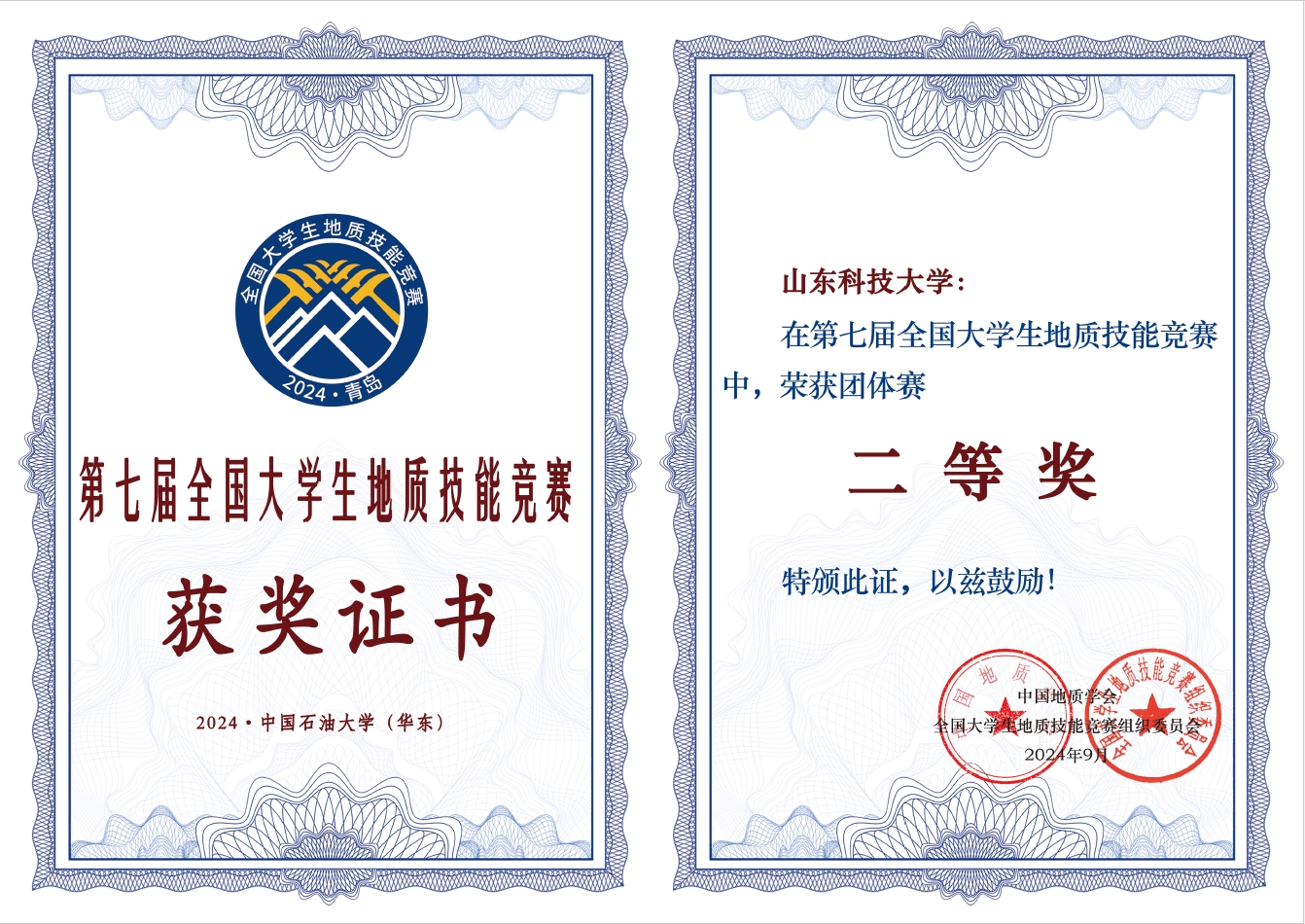 9月6日-8日,由中国地质学会主办,中国地质学会地质教育研究分会、中国石油大学(华东)承办的第七届全国大学生地质技能竞赛在中国石油大学(华东)举行。由经验丰富的金爱文老师带队,张春荣、倪金龙、杜庆祥作为教练指导的资源勘查工程专业邓家榕、翟栋、高娣、丁馨仪、刘昕一、韩欣容、徐弘韬、孟繁骏、王振宇共9名同学组成的3支代表队参加。经过三天激烈的角逐,我院学子凭借扎实的基础获得团体二等奖,3支代表队均获得地质标本鉴定二等奖各1项,2支代表队获得地质技能综合应用二等奖2项,1支代表队获得野外地质技能竞赛二等奖1项。其中地质标本鉴定、地质技能综合应用均为历届最好成绩。