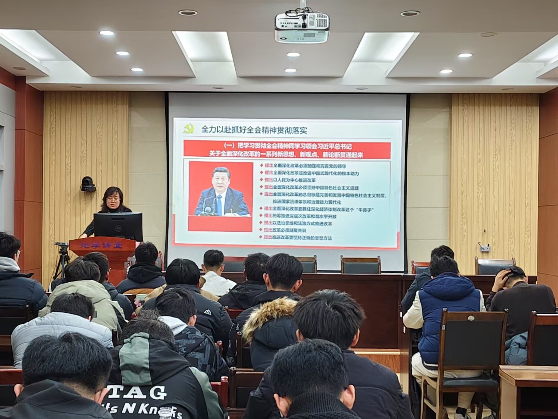 李晓静向同学们介绍了党的二十届三中全会的关键工作和核心内容,并强调习近平总书记的重要讲话不仅为国家全面深化改革绘制了蓝图,也为我们学院发展和同学们的科研创新供了行动指南。她对同学们提出了希望和要求,要持续深入学习党的二十届三中全会精神,不断提高自身的政治站位和思想觉悟;要深刻理解习近平总书记关于全面深化改革的系列新思想、新视角、新论断,将这些理论精髓融入日常学习与研究之中,使之成为激发创新思维、提升科研质量的源泉。