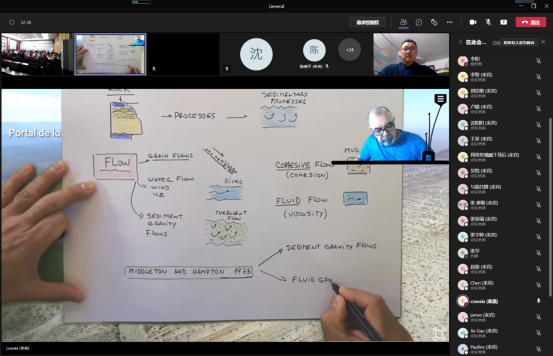 课程上,Carlos教授不仅通过边讲边手绘的方式进行授课,还通过虚拟仿真平台、PPT及播放视频等方式,生动详细的解释了各种牵引流沉积构造的形成机制。Carlos教授科学严谨的科研精神深深地打动了学生。