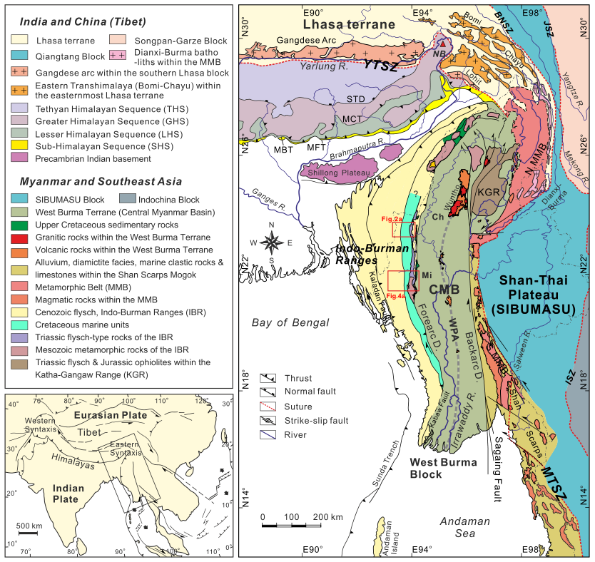 西缅甸地体(WBT)是一个小型地体,东与亚洲Sibumasu地块接壤,西与印缅山脉(IBR)接壤,IBR是印度洋岩石圈在亚洲下方俯冲时形成的一个折返出来的增生楔。了解该区域的地质历史,对于重建特提斯洋闭合和印亚碰撞的历史具有重要意义。
