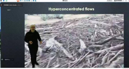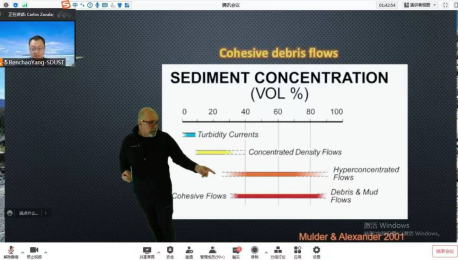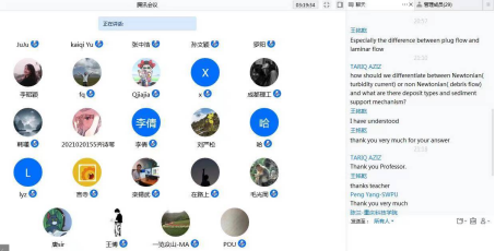 Carlos Zavala教授通过虚拟仿真平台、PPT及播放视频等方式,生动详细的解释了重力流沉积物的形成机制、分类及识别特征。在场师生及直播平台的线上参会人员向Carlos Zavala教授提出许多专业问题,Carlos Zavala教授针对问题进行耐心详细的解答。