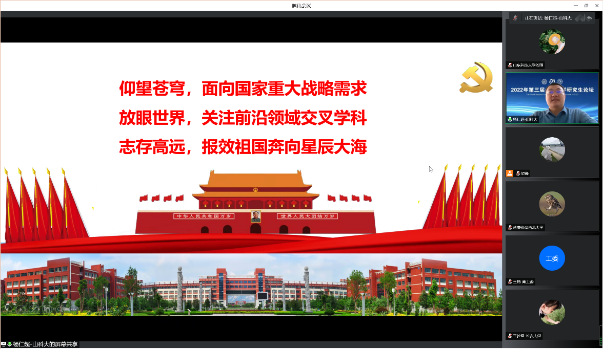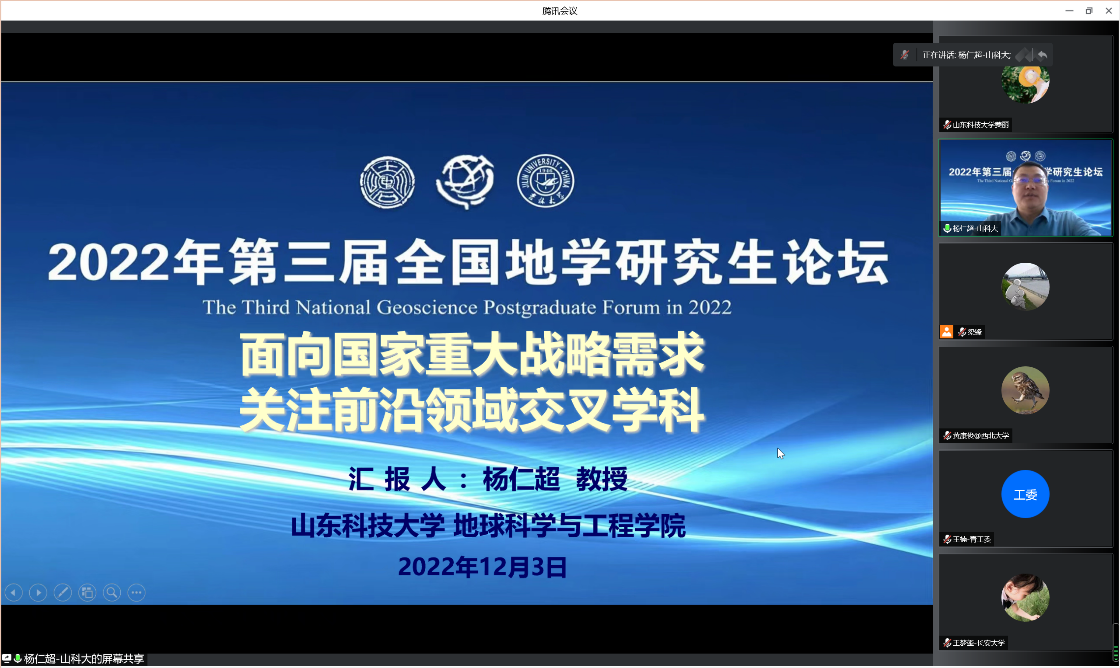 12月3日,由中国地质学会主办,中国地质学会青年工作委员会、吉林大学、吉林省地质学会和吉林省地球物理学会共同承办的第三届全国地学研究生论坛开幕,本次论坛以“学科交叉融合,地学创新发展”为主题。在论坛圆桌会议环节,我校金沙js4399首页副院长杨仁超教授应邀做了题为“面向国家重大战略需求,关注前沿领域交叉学科”的专题报告。