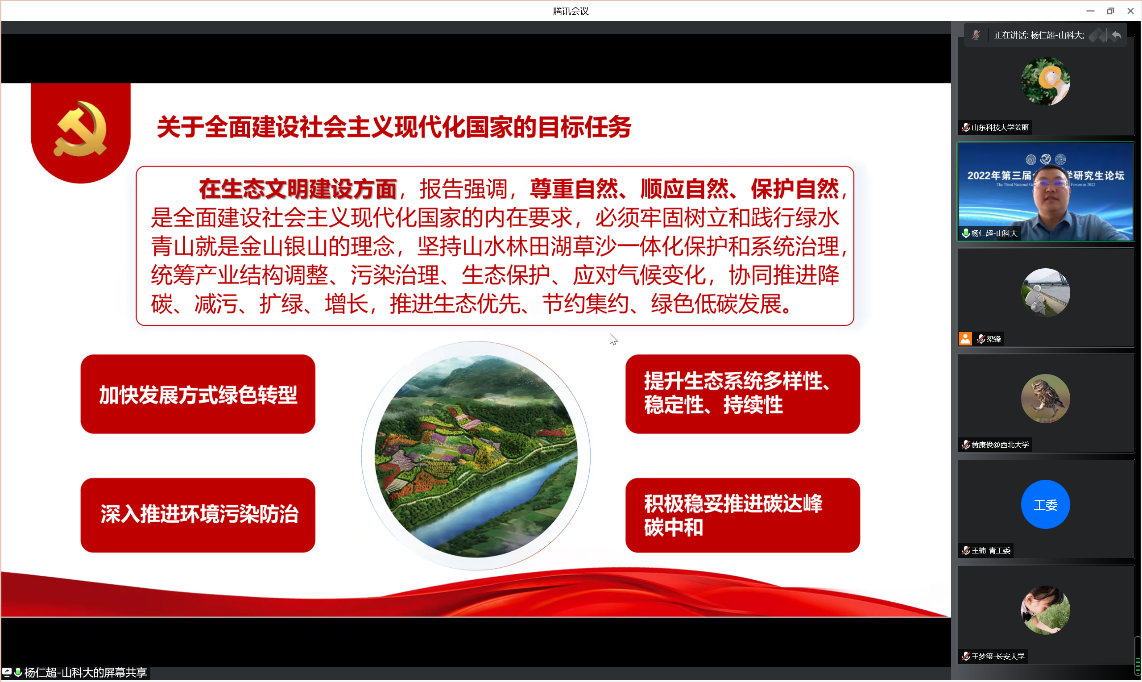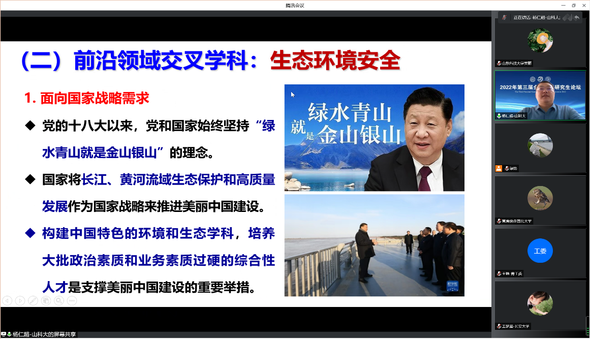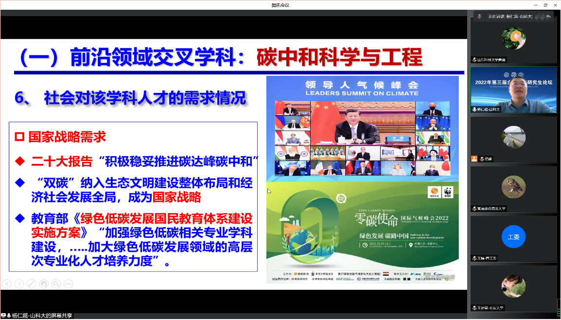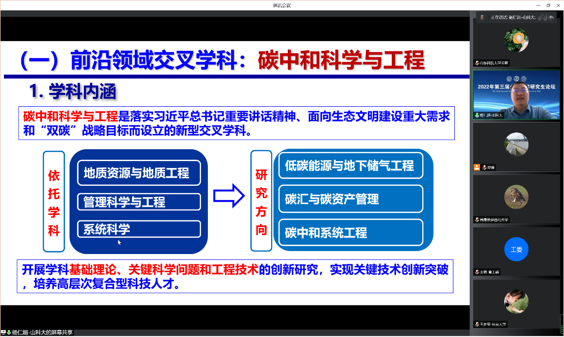 杨仁超教授以党的二十大精神为引领,分别从“面向国家重大战略需求”、“关注前沿领域交叉学科”、“志存高远——寄语青年学子”等三个方面重点阐述了我院在国家“双碳”战略背景下,紧紧围绕党的二十大报告对生态文明建设的战略部署,立足学科深度交叉融合,孕育新的学科生长点,设立“碳中和科学与工程”、“生态环境安全”前沿交叉学科,为国家重大战略提供重要科学支撑,为青年学子的成长成才指明方向。报告最后,杨仁超勉励地学青年学子要仰望苍穹、放眼世界、志存高远,提高服务国家重大战略的自觉性,增强践行国家重大战略的使命感,坚定科技报国的理想信念,为国家的零碳未来作出新的贡献。