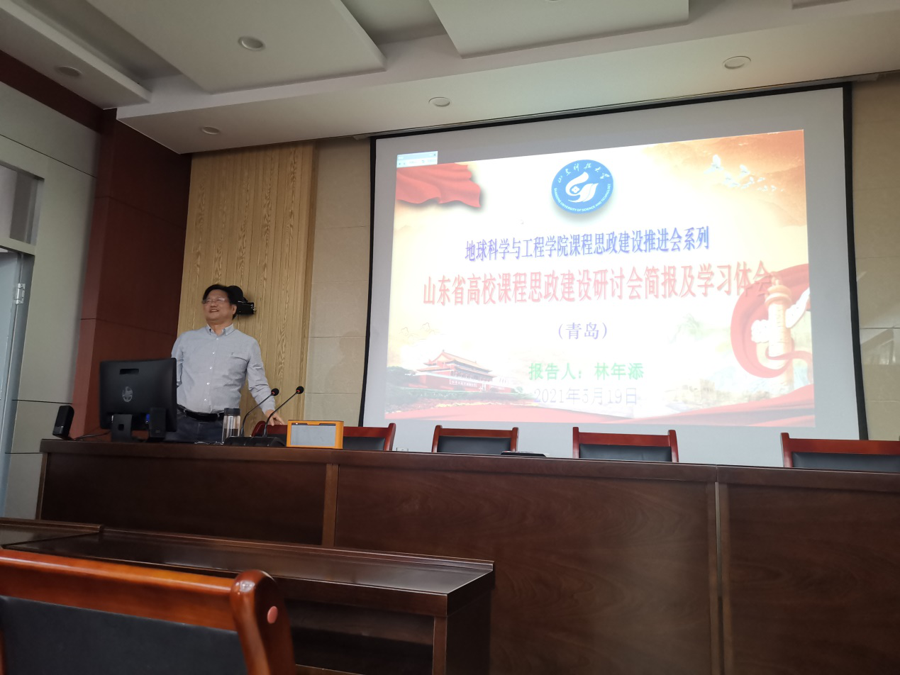 为更好地贯彻落实《高等学校课程思政建设指导纲要》精神和《山东科技大学课程思政建设实施方案》,推进学院课程思政建设,2021年5月19日下午,地球物理系林年添教授在J6-530会议室,为学院教师做了题为《山东省高校课程思政建设研讨会简报及学习体会》的讲座,讲座由学院教学副院长尹会永教授主持。