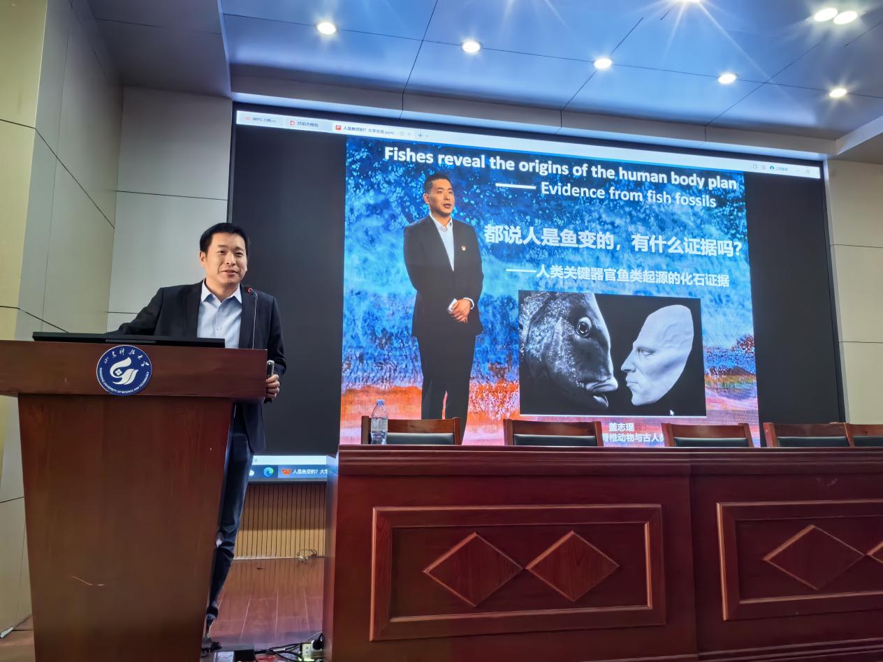 盖志琨研究员从事中国盔甲鱼类研究20多年,成功解决了盔甲鱼类脑颅解剖和身体解剖两大难题,其成果为人类关键器官的起源提供了关键化石证据,并在《Nature》杂志发表,引起学术界广泛关注,证据有力地支撑了“人是鱼变的”这一演化观点,为人类探索自身起源提供了重要依据。会后,盖志琨研究员与参会老师进行了热烈讨论,并邀请学生积极申报中国科学院大学生创新实践训练计划,共探生命演化奥秘,追寻起源足迹,开启震撼科学之旅。盖志琨研究员作为校友,长期指导学院本科生参与科研活动,指导的学生发表多篇高水平论文、曾获挑战杯省赛一等奖,并被央视等多家媒体进行宣传报道。