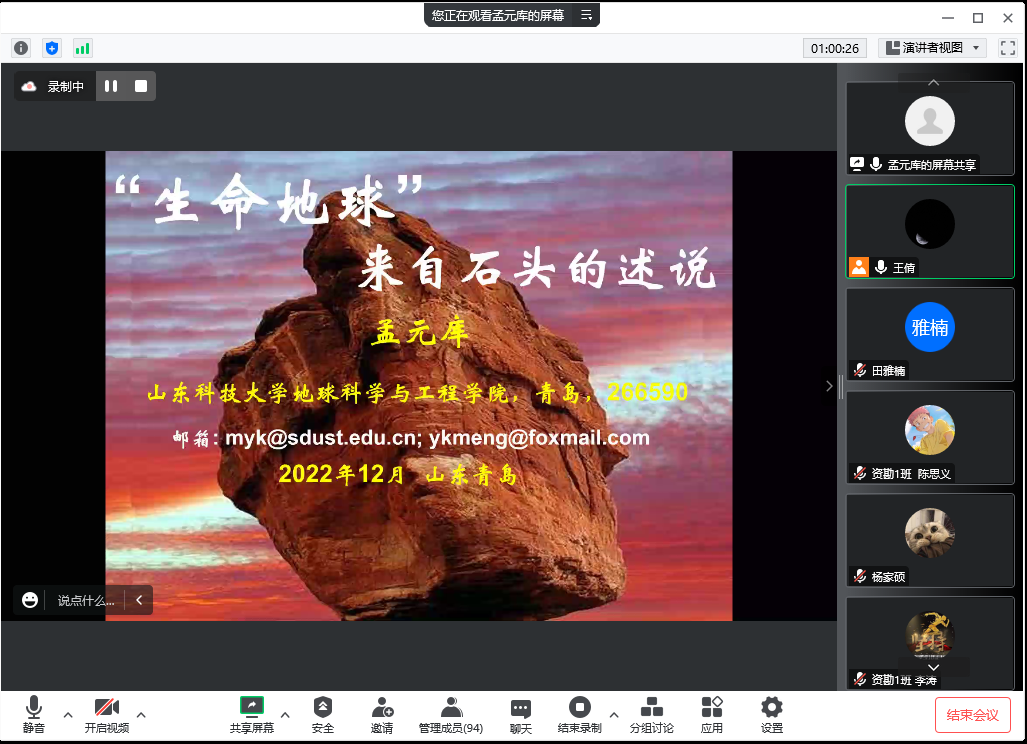 12月8日下午,由金沙js4399首页地球科学馆主办的山东科技大学地球科学科普工作室第1期“嵙话地球”科普讲座以线上形式成功举办,学院2022级资源勘查工程专业本科生及部分研究生聆听了报告。