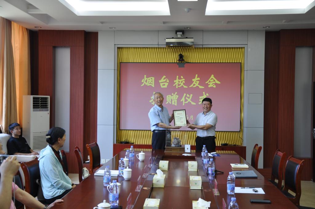 在捐赠现场,张春俊代表烟台校友会捐赠了一件石榴石标本,高慧代表学院接受捐赠,王晓东为张春俊颁发捐赠证书。捐赠仪式后,张春俊一行参观了地球科学馆。