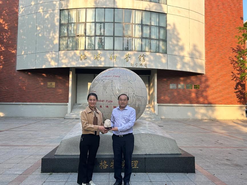 捐赠现场,李先波代表地矿五院向我院捐赠稀土矿、沙漠玫瑰石、三叶虫化石等地质标本18件,王倩代表学院接受捐赠。